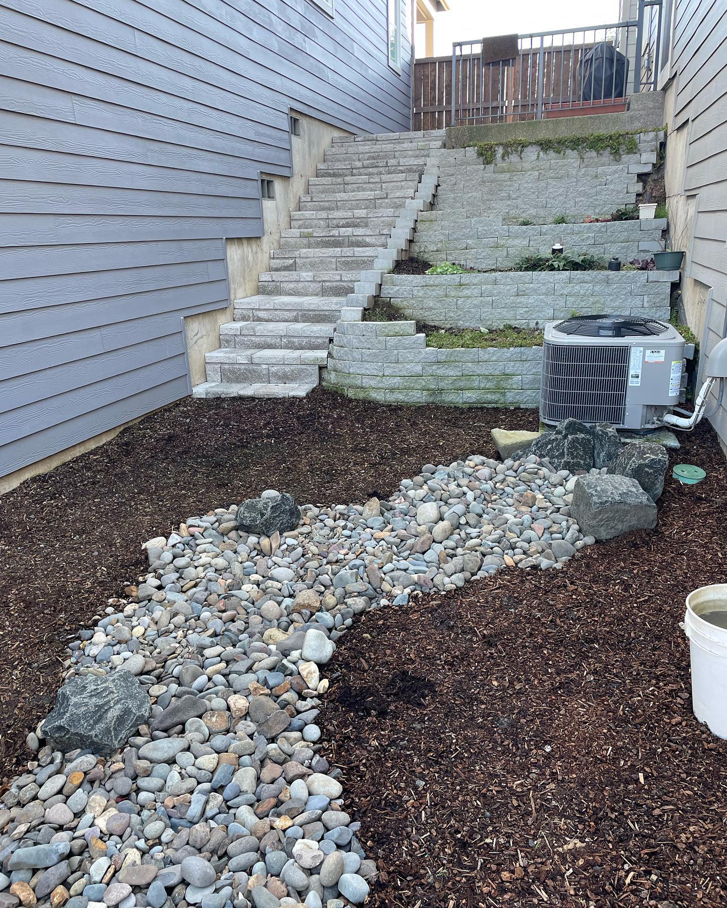 Stormwater Management & Drainage Solutions: French drains, rain gardens, and permeable surfaces to prevent runoff and protect local waterways.